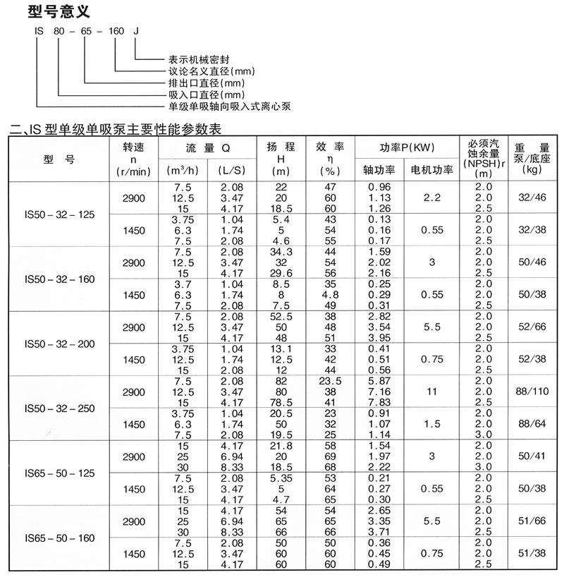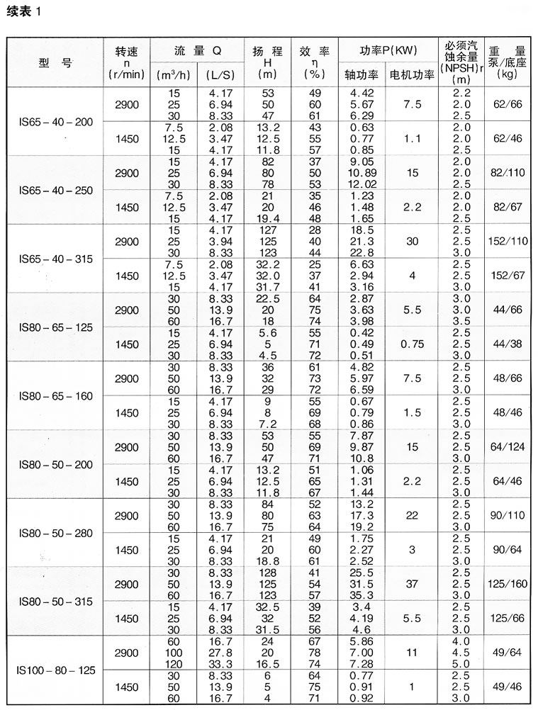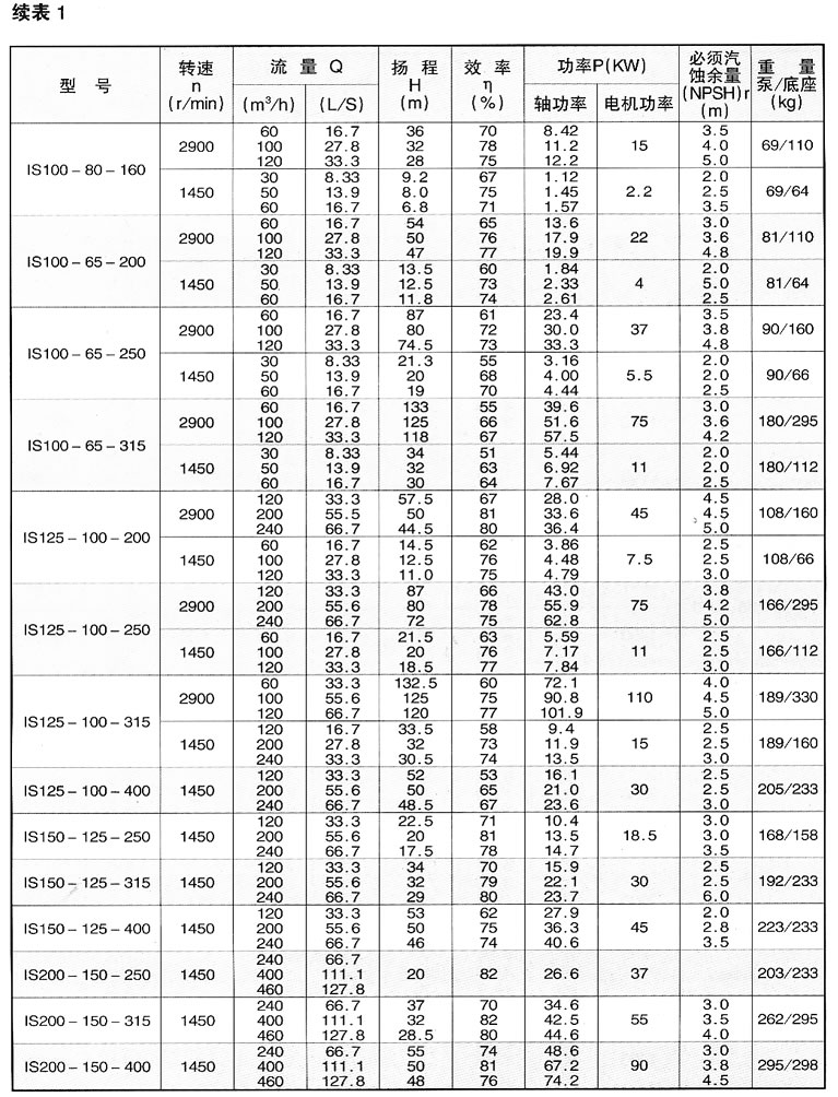 IS型泵系單級(jí)單吸軸向吸入離心泵,適用于工業(yè)和城市給水、排水、亦可用于農(nóng)業(yè)排灌。供輸送清水或物理及化學(xué)性質(zhì)類似于清水的液體,溫度不高80℃,該型泵性能范圍(按設(shè)計(jì)點(diǎn)):流量6.3~400m 3 /h,揚(yáng)程5~125m。