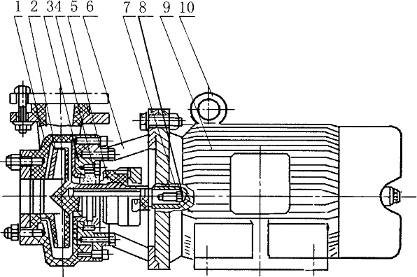 1泵體 2葉輪 3后蓋 4壓蓋 5螺栓 6靜環(huán) 7支架 8動環(huán) 9電機 10吊環(huán)