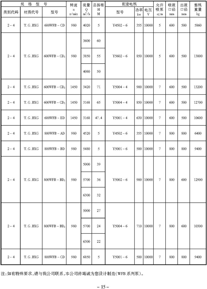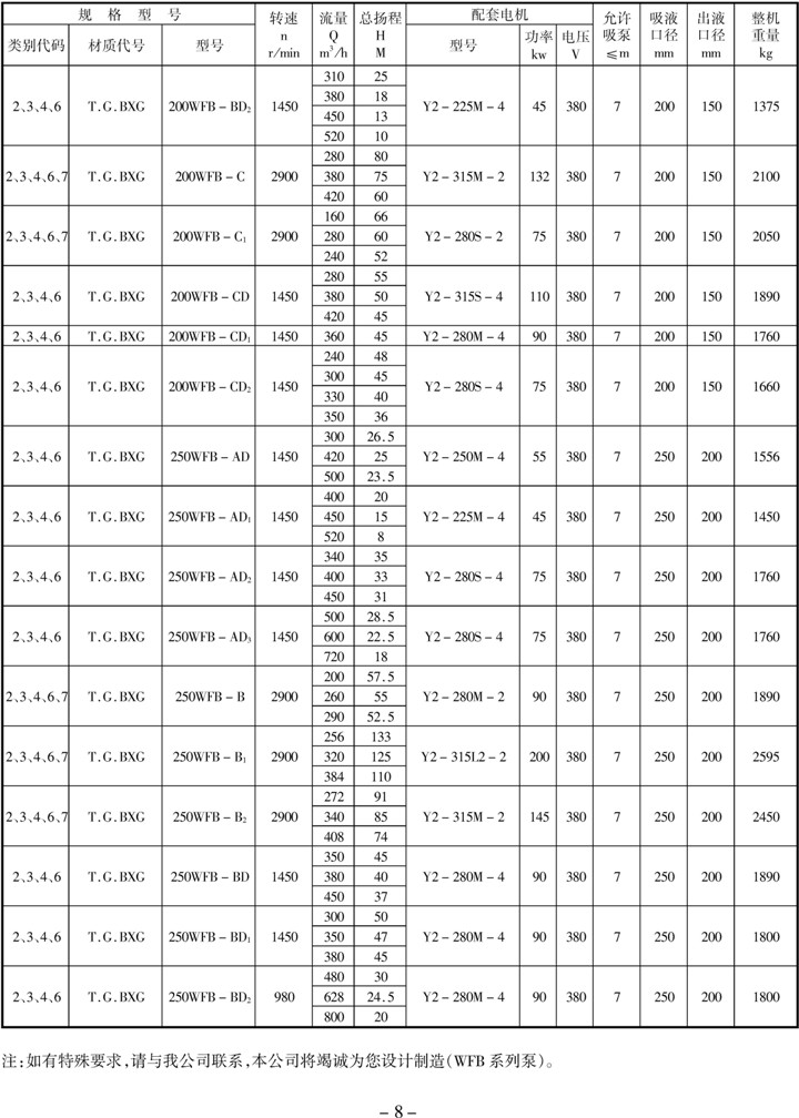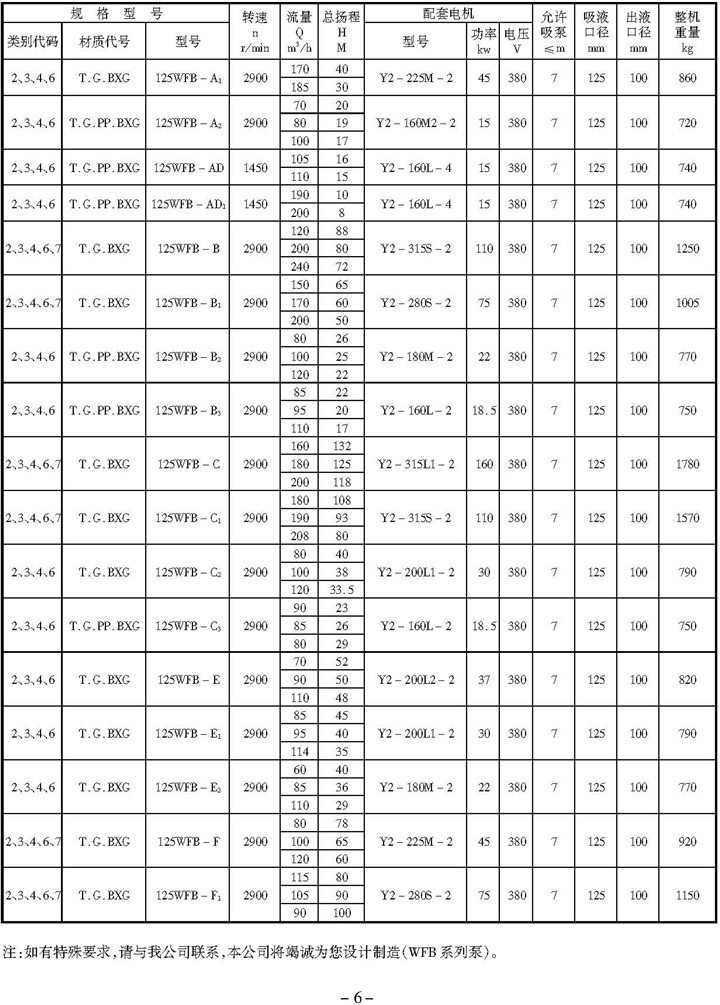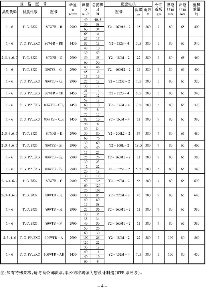 (1)性能參數(shù)表中“類別代碼”欄的1-7含義:1型為長方型,2型為圓錐型,3型為防爆型,4型為戶外型,5型為推車移動型,6型為防凍型,7型為多級型;“材質(zhì)符號”欄中T、G、PP、BXG四組字母分別代表:鈦、鋼(碳鋼、耐磨鋼:JM3,JM6)、增強(qiáng)聚丙烯、不銹鋼(321、304、316、316L)四種材質(zhì)。
