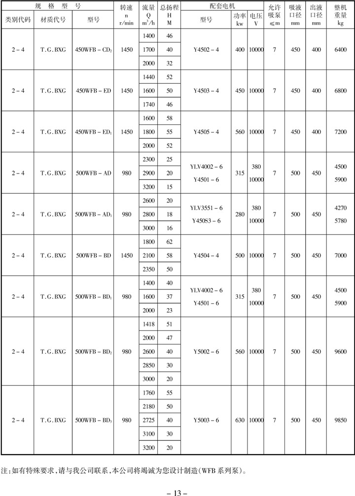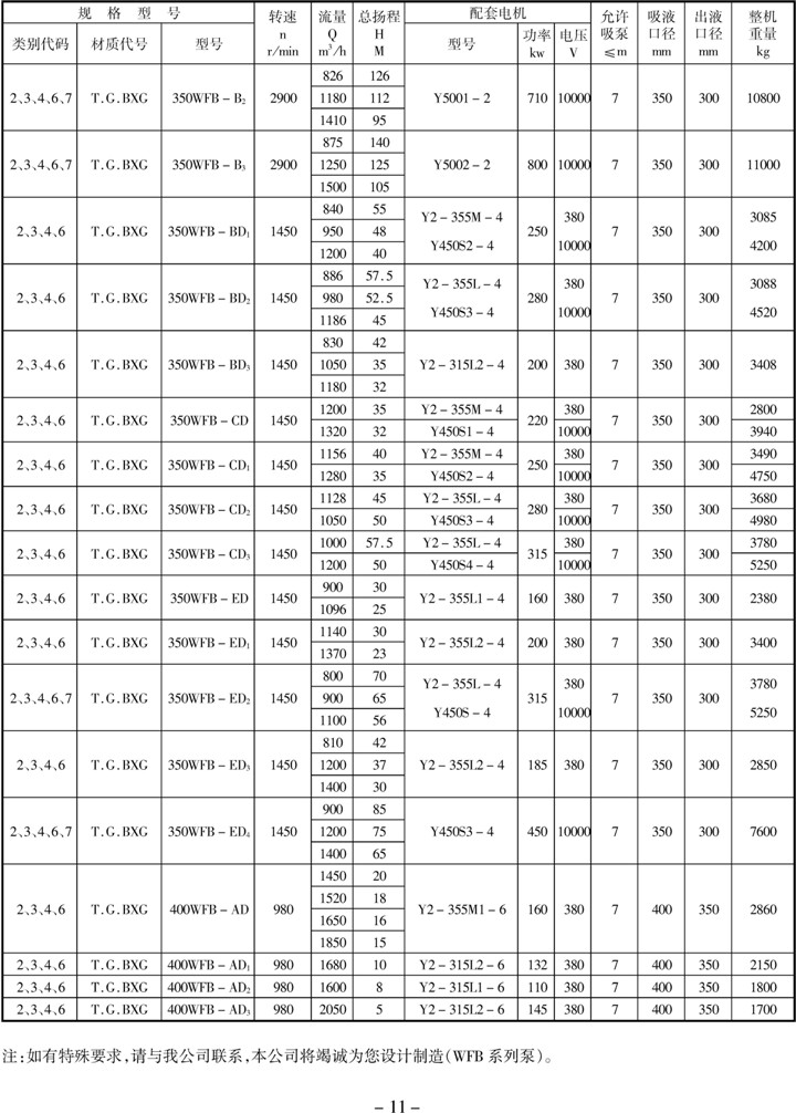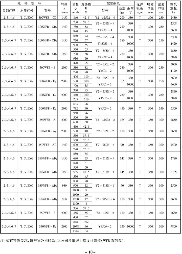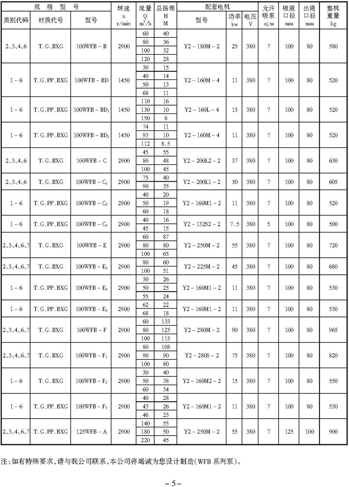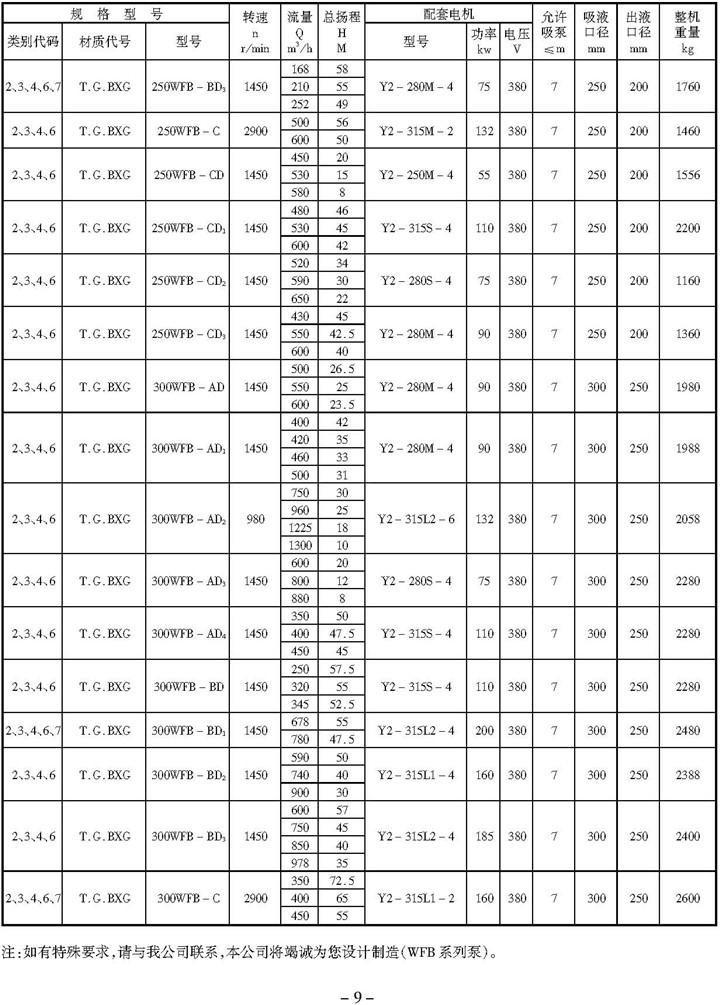 (1)性能參數(shù)表中“類別代碼”欄的1-7含義:1型為長方型,2型為圓錐型,3型為防爆型,4型為戶外型,5型為推車移動型,6型為防凍型,7型為多級型;“材質(zhì)符號”欄中T、G、PP、BXG四組字母分別代表:鈦、鋼(碳鋼、耐磨鋼:JM3,JM6)、增強(qiáng)聚丙烯、不銹鋼(321、304、316、316L)四種材質(zhì)。